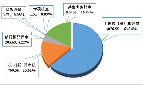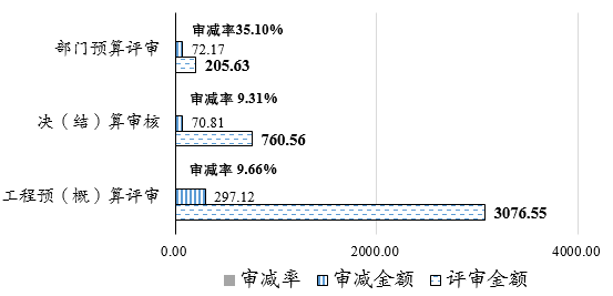 审减资金440.10亿元。2020年全省工程预(概)算、决(结)算评审及部门预算评审调减资金440.10亿元,较上年增长6.30%,平均审减率达10.88%。连续3年年均审减率超过10%。各类评审业务审减资金情况如图2所示: